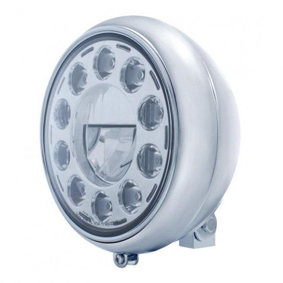 - LED headlight features single high power low beam LED and 10 outer LED with chrome housing.